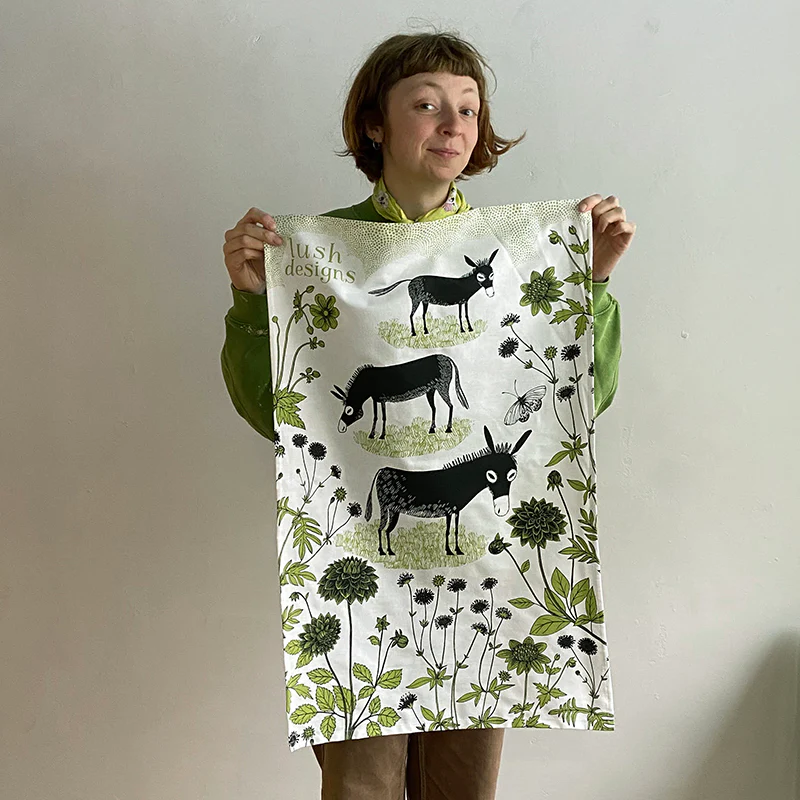 Sweet donkeys in a meadow. Surrounded by flowers in the freshest green. Inspired by the retired donkeys of Eltham who for many years gave rides to children on Blackheath in South East London.