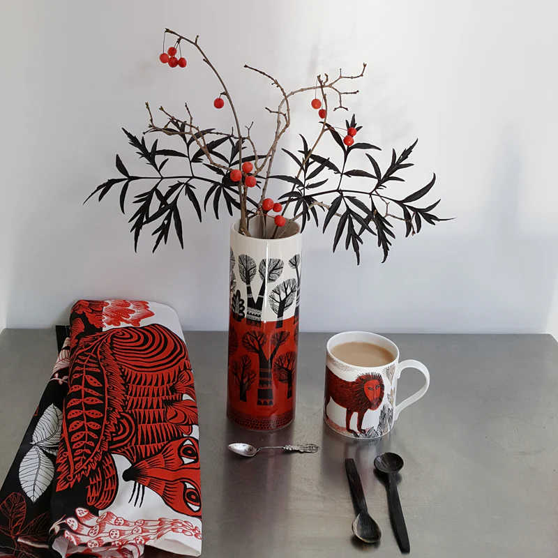 OUR foxes are ever so sweet, and this vixen and her cubs in a flowery dell printed on a cotton tea towel will make even the dullest kitchen task more interesting. The red and black print looks great on our matching apron too.